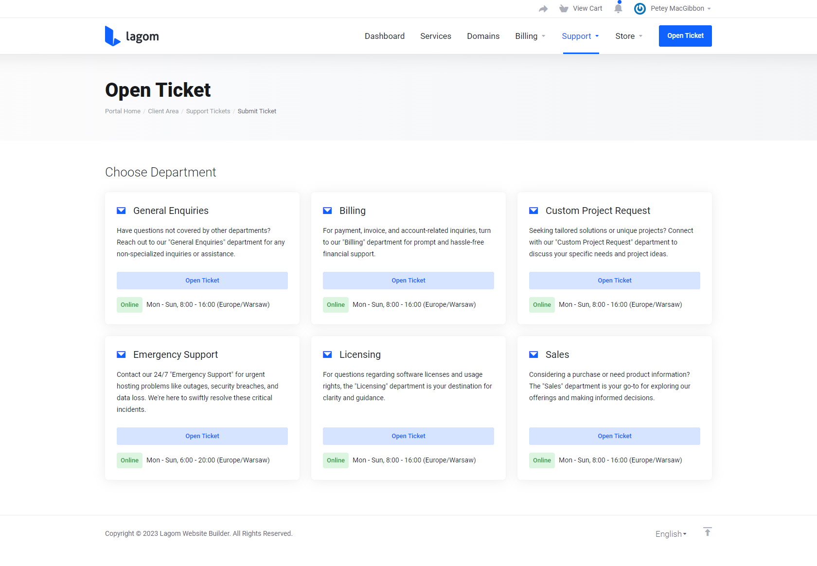 Display your company’s working hours directly in the client area with the Support Hours extension for Lagom WHMCS Client Theme. Keep customers informed about your support availability and reduce unnecessary tickets during offline hours.